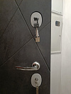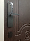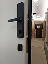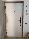 Дверь для квартиры, где важны тишина и порядок: снаружи и изнутри — строгие светлые панели МДФ с тонкой рамочной фрезеровкой, которые легко протереть и сложно поцарапать, а в подъезде не выгорают и не набирают грязь взглядом. Главная фишка — биометрический замок с интегрированным сканером в ручке: открыл пальцем и пошёл, без лишних связок ключей. Лаконичный глазок остаётся почти незаметным, а чёрная фурнитура подчёркивает графичность полотна. Темный короб формирует аккуратный контур проёма и визуально «заземляет» белую плоскость двери. Конструкция собрана рационально и без лишнего декора — это про современный стиль, повседневное удобство и спокойствие хозяев.