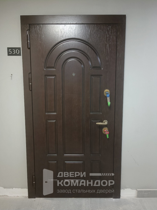 Входная дверь для широкого коридора с двойными створками, обеспечивает исключительную прочность и сопротивление взлому. В дизайне используются элегантные филенки, надежные замки и засовы, повышающие безопасность. Она защищает от сквозняков, не выпускает горячий воздух изнутри, тем самым сохраняя тепло в зимний период. Конструкция также устойчива к коррозии, что гарантирует долговечность даже при проникновении влаги внутрь.