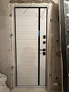 Для входа в квартиру — самое то: снаружи глубокий графит с частой горизонтальной фрезеровкой поглощает блики и дисциплинирует вид площадки, изнутри — чистый белый МДФ с темной вертикальной вставкой у замковой зоны, аккуратно вытягивает полотно и не требователен в уборке. Панели стойко переносят повседневные касания и влажную протирку, не выгорают в подъезде и сохраняют рельеф. В модели мхм-3 феррони обращают на себя внимание два независимых замковых узла, плотный притвор и противосъёмные ригели на петлевой стороне — дверь закрывается мягко и держит тишину в квартире. Видимые петли надежные и легко обслуживаются, фурнитура в матовом чёрном подчеркивает геометрию. Наличники можно согласовать по цвету, при необходимости предусмотрено место под видеодомофон — получится аккуратный, собранный портал.