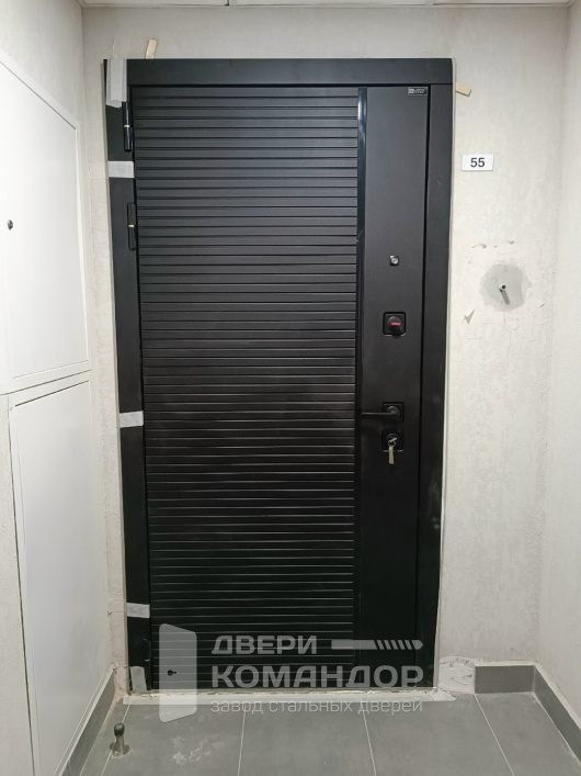 Эта дверь создана для квартиры: снаружи — строгая тёмная панель с горизонтальной фрезеровкой «Лабиринт», практичная и немаркая в подъезде; внутри — белый софт с зеркалом во всю высоту, которое визуально расширяет коридор и помогает собрать образ перед выходом. Обе стороны — МДФ: материал тёплый на ощупь, устойчив к повседневным царапинам и легко очищается без капризов. Внутренняя фурнитура в чётком матовом исполнении, глазок даёт обзор, а разнесённые по высоте замки с мощными ригелями обеспечивают понятную защиту. Три контура уплотнения по периметру глушат звуки подъезда и отсекут сквозняк. Спокойный контраст белого и графитового смотрится современно и не спорит ни с нейтральной отделкой, ни с ярким интерьером.