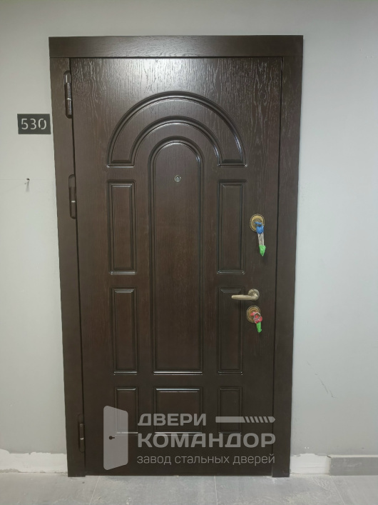 Дверь задумана для квартиры: снаружи тёплая древесная фактура шпона с аккуратной фрезеровкой задаёт спокойный тон подъезда, внутри гладкая матовая эмаль освежает прихожую и лучше отражает свет. МДФ-панели работают на практичность — стойки к мелким царапинам, не боятся частой уборки, долго держат цвет, а двухцветная окраска металла подчёркивает геометрию полотна и коробки. В двери со шпоном и змалью, выполненной с двухцветной окраской металла на заказ, мы аккуратно подберём наличники и доборы в тон, чтобы портал выглядел единым. При желании подготовим место под видеодомофон — удобно контролировать вход без лишних проводов на виду. В итоге получаете тихий, продуманный вход: визуально лёгкий внутри и статусный снаружи, без компромиссов по ресурсу отделки.