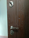 Входная дверь для квартиры, где хочется тишины и стиля. Снаружи — тёмное дерево с выразительной текстурой и классической филёнкой с мягкой аркой: строго, солидно, без показной декоративности. Сбоку — узкая боковая фрамуга, визуально расширяющая проём и придающая входу законченный вид. Внутри — светлая МДФ-отделка с тремя вертикальными полосами и зеркальной центральной вставкой: она вытягивает коридор, помогает собрать образ у выхода и защищена плёнкой на время ремонта. МДФ устойчив к мелким царапинам, легко моется и годами сохраняет цвет в подъезде, а плотные контуры уплотнения приглушают шум. Усиленный стальной короб с аккуратными монтажными пластинами и доборным формованием прилегает ровно, фурнитура в холодном металле ощущается надёжно. Рациональный выбор для тех, кто ценит порядок и спокойный дизайн.