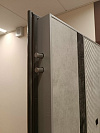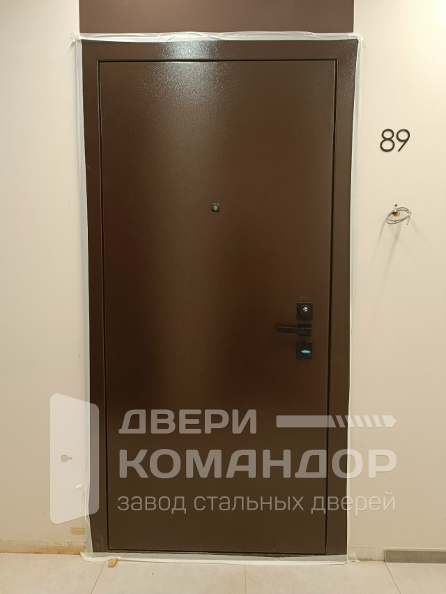 Для квартиры и тёплого подъезда — строгая, практичная дверь с характером. Снаружи — порошковая шагрень глубокого коричневого оттенка: фактура скрывает мелкие следы эксплуатации и стойко переносит ежедневные касания. Внутри — МДФ в светло-сером «бетоне» с тонкой диагональной фрезеровкой и контрастной вертикальной вставкой: панель выглядит архитектурно и легко протирается, не выцветает и не боится перепадов влажности в доме. Квадратные накладки и ручка под матовый чёрный поддерживают минимализм. Двухсистемный замок Mottura с девиаторами запирает полотно в нескольких точках, обеспечивает жёсткую фиксацию без люфтов; по периметру — уплотнение для мягкого и тихого закрывания. На петлевой стороне — парные противосъёмные ригели, снаружи — аккуратный глазок. Надёжная основа интерьера, которая каждый день встречает и провожает без лишнего пафоса.