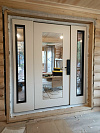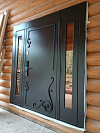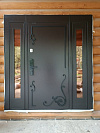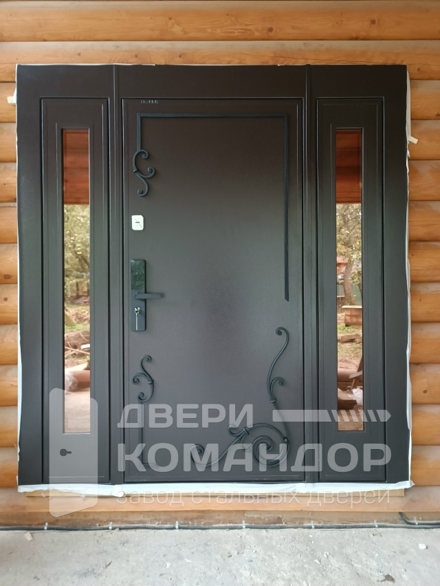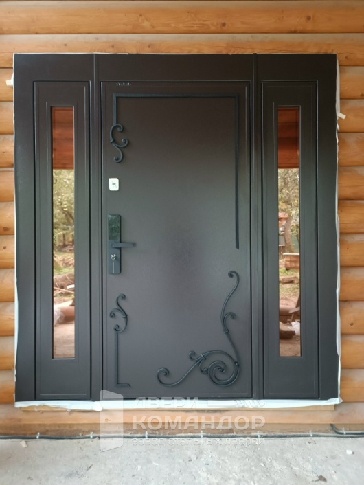 Это решение для входа в частный дом: уличная сторона в стойком порошковом напылении защищена от дождя, снега и царапин, внутри — аккуратная МДФ-панель под спокойный белый, которая легко моется и не боится повседневных прикосновений. Терморазрыв разрывает мост холода, поэтому пол и ручка остаются тёплыми даже в минусовую погоду. Визуальный центр — боковые фрамуги со стеклопакетами: они добавляют свет в прихожую и расширяют проём без ощущения тяжести. На наружном полотне — аккуратные кованые завитки и строгие фрезы, создающие объём без лишней вычурности. Биометрический замок со сканером отпечатка избавляет от связки ключей, при этом сохраняется привычная механика. Усиленные петли и плотные контуры уплотнения дают тихий ход и уверенное закрывание — дверь работает мягко, а выглядит статусно.