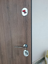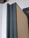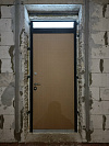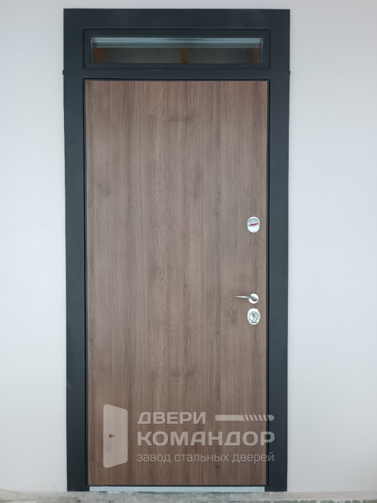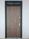 Для частного дома на улицу: сдержанная дверь в темном графитовом коробе и теплой древесной фактурой полотна. Сверху — узкая фрамуга со стеклопакетом, впускает дневной свет в тамбур без лишнего обзора снаружи. Наружная МДФ-панель с защитным покрытием устойчива к мелким царапинам и перепадам погоды, внутри сейчас установлена временная панель — она бережёт отделку на стадии ремонта и легко заменяется на МДФ в тон интерьеру. Терморазрыв отсекaет холод, убирает конденсат и промерзание зоны замка. Во входной двери stardis termo чувствуется спокойная мощь: плотные контуры, уверенный ход фурнитуры, аккуратные притворы и готовность к подключению видеодомофона — все для комфортного и тёплого входа круглый год.