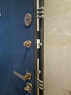 Stardis Trend — дверь для квартиры с аккуратным расширением проёма: порталом в тон наружной отделки, чтобы вход выглядел цельно и «дорого». Снаружи — тёплая древесная фактура МДФ с тонкими фрезами по периметру; она устойчиво переносит повседневные касания, не боится влажной уборки и мелких царапин, не теряет цвет под светом в подъезде. Изнутри — глубокий матовый синий с диагональной 3D-фрезеровкой: рельеф визуально вытягивает полотно и добавляет динамики прихожей. Фурнитура в тёплом металле ложится в ладонь и подчёркивает контраст двух отделок. Два разнесённых замка работают мягко; изнутри — удобная «ночная» задвижка. Контуры уплотнения по периметру гасят звук и запахи с лестничной клетки, дверь закрывается плотно и бесшумно.
