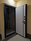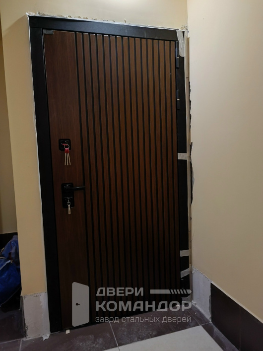 Это дверь для городской квартиры: со стороны подъезда — тёплая МДФ-панель под дерево с узкими вертикальными ламелями, которые визуально вытягивают полотно и отлично маскируют мелкие следы касаний; изнутри — белый софт с тонкой горизонтальной насечкой и графитовой вертикальной вставкой, создающей аккуратный акцент у зоны замков. У Storm Ю (22) белого софта с чёрной вставкой лабиринт с наращиванием проёма всё продумано до бытовых мелочей: плотный притвор, несколько контуров уплотнения, тихое закрывание, подготовка под видеодомофон. МДФ устойчив к выцветанию в подъезде, не боится влажной уборки и случайных царапин ключами. Фурнитура в матовом чёрном тоне подчёркивает геометрию, а доборы и наличники можно выполнить в цвет, собирая аккуратный портал без визуального шума.