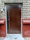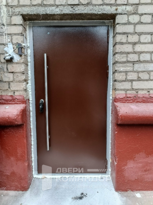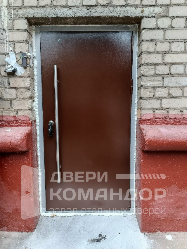 Практичная входная дверь для медцентра и других помещений с потоком людей: металл с обеих сторон, стойкое порошковое покрытие, которое не боится дезсредств и частых протирок. Снаружи и внутри — ровная коричневая «шагрень», на фасаде удобная вертикальная ручка-скоба из нержавейки: за неё легко взяться в перчатках. Доводчик мягко закрывает полотно без хлопков, а терморазрыв снижает промерзание и конденсат на уличной стороне. Видны плотные контуры уплотнения, противосъёмный штырь на петлевой стороне и глазок — мелочи, которые в работе решают. В двери терморазрыв металл / металл с доводчиком на заказ для медцентра собраны требования эксплуатации и санитарии без лишнего декора; по запросу сделаем наличники и доборы в цвет, предусмотрена установка видеодомофона.