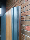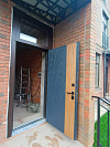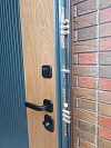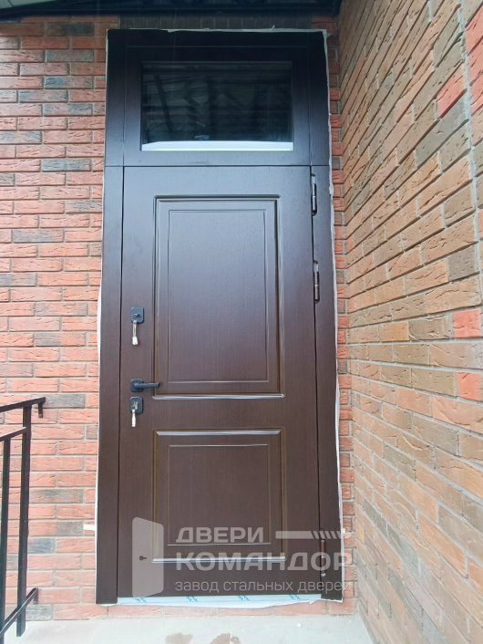 Дверь с терморазрывом для частного дома: уверенно работает на улице и держит перепады. Снаружи — классическая филёнка под темное дерево, солидно смотрится на кирпичном фасаде и устойчива к дождю и солнцу; внутри — контрастная композиция: графитовая рифлёная полоса и вставка под светлый дуб, добавляющая тепла прихожей. Двухцветная окраска металла поддерживает интерьер и фасад по разные стороны. МДФ с обеих сторон гасит шум и бережёт тепло, магнитные уплотнители мягко тянут полотно к коробке, порог из нержавейки не боится влаги и соли. Над полотном — фрамуга со стеклопакетом, даёт свет без сквозняков. Усиленная замковая зона и противосъёмный штырь видны на фото.