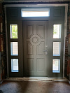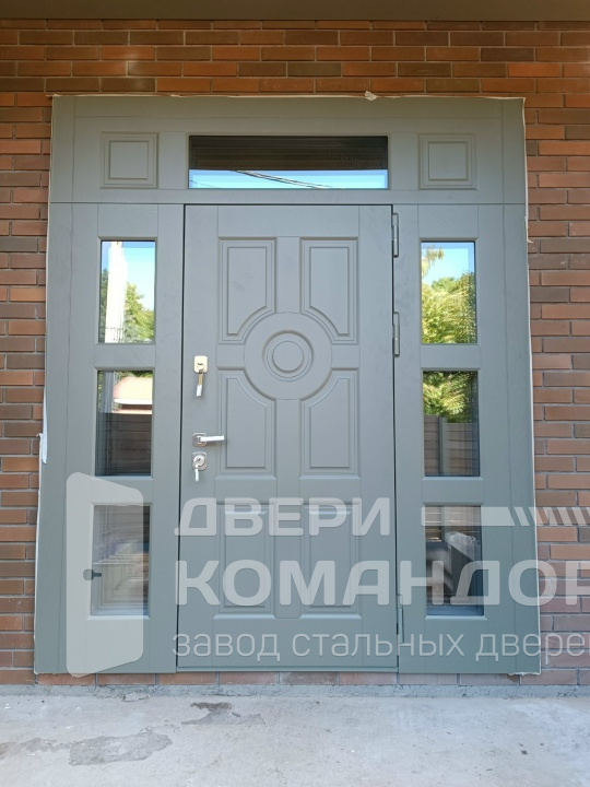 Этот входной портал для частного дома сразу даёт свет и статус: по обе стороны полотна — узкие остеклённые вставки с тройным ритмом, сверху — горизонтальная фрамуга. Глухое полотно с фигурной фрезеровкой и центральным медальоном выглядит солидно, при этом стеклопакеты в фрамугах оставляют прихожую яркой днём. Внутри и снаружи — МДФ-накладки, устойчивые к истиранию и случайным царапинам, их легко мыть, они не выгорают. В версии входной двери терморазрыв шпон / шпон с боковыми и верхней фрамугами со стеклопакетами на заказ тепло не уходит через металл: терморазрыв отсоединяет улицу от дома, уменьшая конденсат. Два разнесённых замка с мощными ригелями, противосъёмный штырь и три петли дают спокойный, плавный ход и надёжное запирание каждый день.