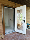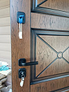 Эта дверь создана для частного дома и уверенно работает на улице: снаружи — фактурный шпон под дерево с объёмными косыми филёнками, внутри — белая панель с высоким зеркалом-эмалью, которое добавляет свет и визуально расширяет прихожую. Металл окрашен в два цвета: чёрная коробка подчёркивает контур, белое полотно изнутри поддерживает современный интерьер. МДФ-накладки устойчивы к царапинам и выгоранию, легко моются. Терморазрыв разрывает мост холода, снижая конденсат и сквозняки. Магнитные уплотнители мягко подтягивают полотно без хлопка, нержавеющий порог не боится влаги и реагентов. Два разнесённых замка и аккуратная чёрная фурнитура завершают образ и добавляют спокойствия владельцу.
