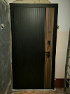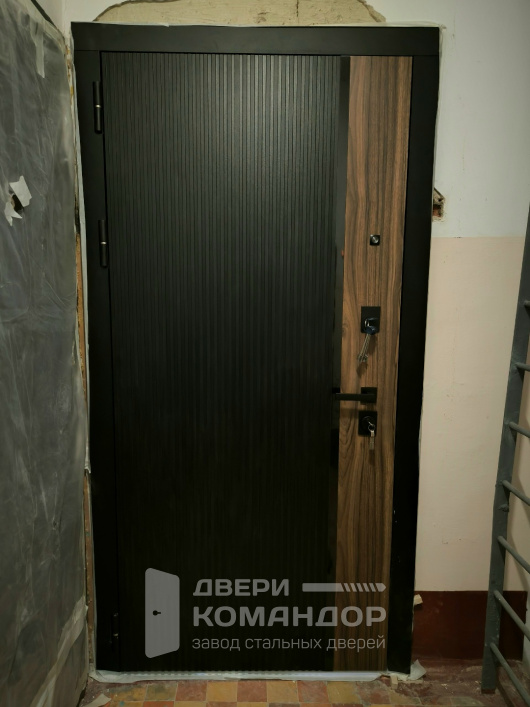 Для подъездной квартиры это спокойный, но выразительный вход: снаружи рифлёная чёрная панель и контрастная вставка под тёплый орех вытягивают полотно по высоте, визуально собирая проём. Обе стороны отделаны МДФ — материал тёплый на ощупь, не боится частых прикосновений, легко очищается, устойчив к мелким царапинам. Внутри — светлая рифлёная панель, она подсвечивает узкую прихожую и не спорит с мебелью. У входной двери YoDoors-14 Дверей Регионов из типовой серии I-515/25БИ фурнитура в матовом чёрном и аккуратные квадратные накладки; изнутри предусмотрена ночная задвижка, по контуру — уплотнение для плотного прижима. Возможна установка видеодомофона и доборов в общий тон, чтобы закрыть монтажный шов и получить чистую рамку проёма.